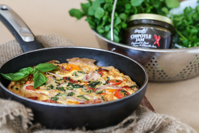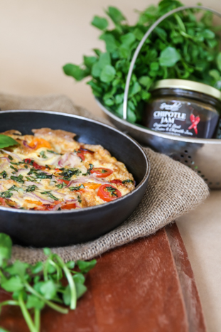 Serve with some fresh peppery watercress, a little basil and top up with a spoon of Chipotle jam.